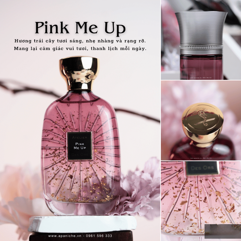 Atelier des Ors – một nhà nước hoa độc lập đến từ Pháp, đã nhanh chóng ghi dấu ấn trong giới nước hoa cao cấp từ khi ra mắt vào năm 2015. Đúng như tên gọi, “Xưởng Vàng” này không chỉ mang đến những mùi hương đậm chất nghệ thuật. Mà họ còn tạo nên dấu ấn thị giác khó quên với những thiết kế chai sang trọng, tinh tế. Mỗi lọ nước hoa của Atelier des Ors chứa đựng bên trong những lá vàng lấp lánh. Hình thức tỏa sáng song hành cùng tinh túy hương thơm đầy cảm hứng.Trong đó, Pink Me Up Atelier Des Ors là một sáng tạo đầy vui tươi và năng động.