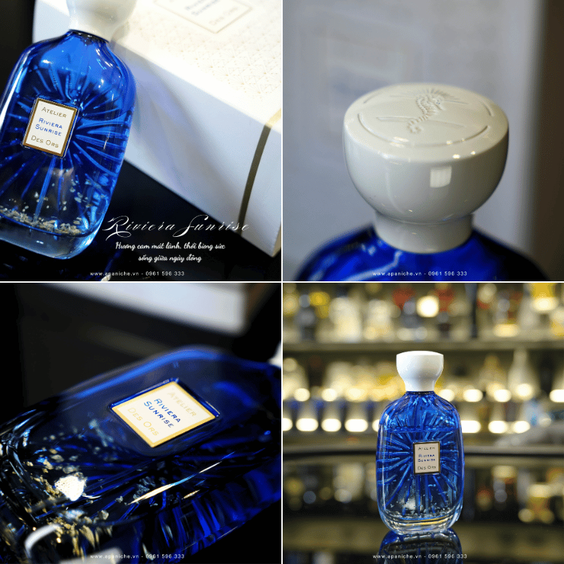 Vẫn giữ tinh thần đặc trưng của Atelier des Ors, chai nước hoa Atelier Riviera Sunrise được chế tác như một món trang sức tinh xảo. Thân chai thuỷ tinh mang sắc xanh biển trong vắt, vừa mát lành vừa sang trọng, gợi cảm giác về bầu trời và làn nước Địa Trung Hải. Ẩn bên trong là các vảy vàng 24K lấp lánh, biểu tượng của sự xa hoa, tinh tế và nghệ thuật độc quyền từ thương hiệu này. Từng đường cắt, chi tiết đều được hoàn thiện chỉn chu, thể hiện đẳng cấp của một sản phẩm niche thực thụ.