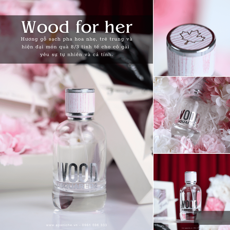Dsquared2 Wood for her EDT của thương hiệu DSQUARED2, được ra mắt vào năm 2018. Thuộc nhóm hương hoa cỏ gỗ và xạ hương, nước hoa mang đến những trải nghiệm mới lạ và gợi cảm. Hương thơm được tạo nên từ sự kết hợp ấm áp từ gỗ và nhẹ nhàng từ hoa.