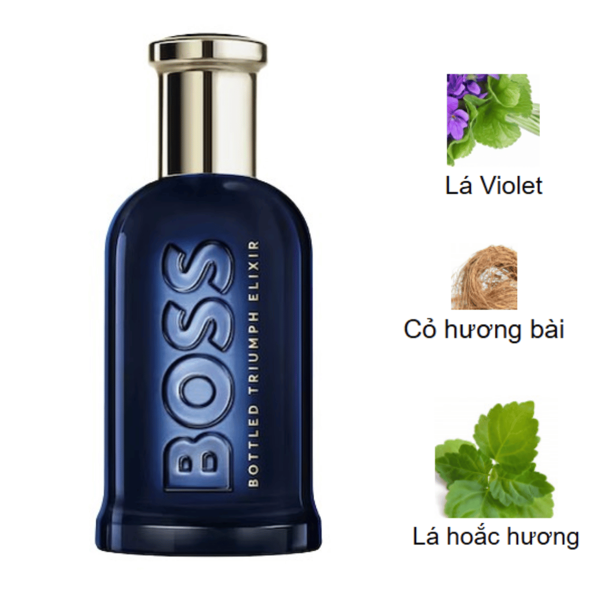 Hugo Boss Bottled Triumph Elixir Parfum Intense mở ra một mùi hương nam tính đầy chiều sâu, vừa hiện đại vừa sắc sảo. Sự hòa quyện giữa lá violet xanh mát, cỏ hương bài khô ráo và nét âm trầm của hoắc hương tạo nên một tổng thể cuốn hút, để lại dấu ấn mạnh mẽ nhưng không hề phô trương.