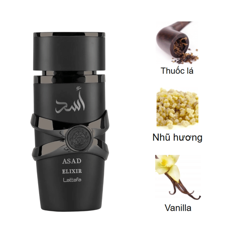 Lattafa Asad Elixir EDP là mùi hương phương Đông ấm và đậm, nổi bật với thuốc lá khô, gia vị cay và vani trầm, được bao bọc bởi lớp nhựa thơm khô ráo. Tổng thể mang cảm giác nam tính, chững chạc và có chiều sâu, càng về sau càng rõ dấu ấn.