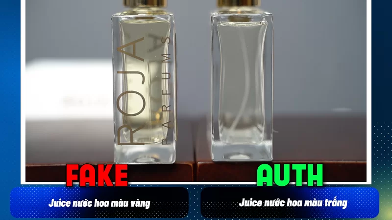 Màu juice (nước hoa bên trong) là một điểm quan trọng giúp nhận biết nước hoa Roja Oceania thật và giả. Roja Oceania thật luôn có màu sắc nước hoa đồng đều, tinh khiết, có màu trắng trong trông vô cùng tinh tế. Trong khi đó, chai nước hoa fake lại có màu hơi ngả vàng như màu nước chè loãng, mất hẳn đi vẻ tinh tế vốn có của sản phẩm nước hoa gốc.