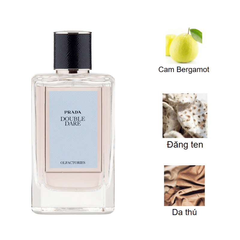 Ngay từ lớp hương đầu, cam Bergamot kết hợp tiêu và hồng tiêu tạo hiệu ứng cay ấm nhẹ nhàng, khiến mùi da thuộc ở phía sau trở nên mềm và dễ chịu hơn. Khi mùi chuyển sang tầng giữa, diên vĩ, labdanum và hoa hồng mang đến sự mượt mà và hài hòa, giúp toàn bộ cấu trúc trở nên thanh lịch hơn. Lớp hương cuối là nơi Double Dare Prada thể hiện rõ cá tính: da thuộc, da lộn, nhựa thơm Tolu cùng gỗ hổ phách, hoắc hương và chút vani tạo cảm giác ấm áp, sang trọng, bám vào da rất tự nhiên. Tổng thể là một mùi da thuộc hiện đại, ấm áp nhưng không nặng nề.