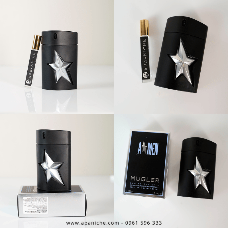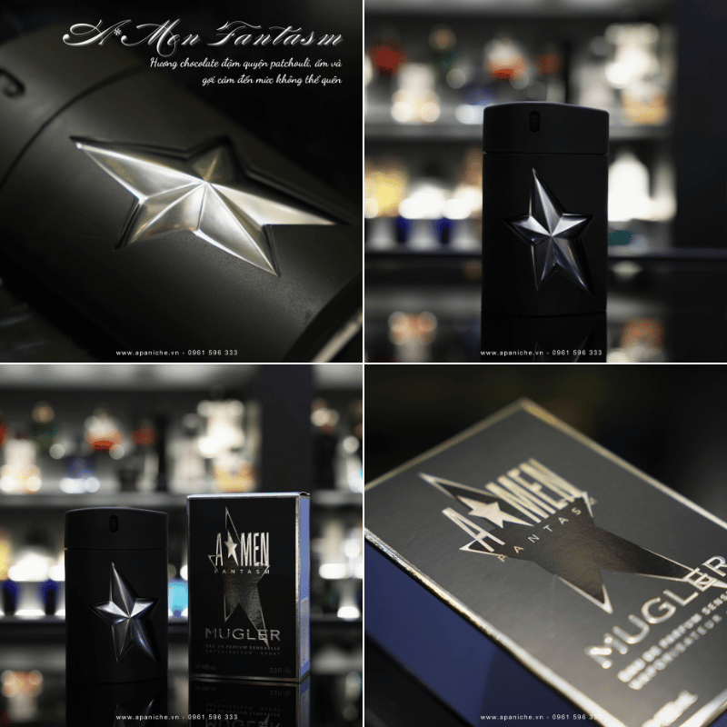 Thiết kế chai Mugler Amen Fantasm giữ nguyên DNA đặc trưng của dòng A*Men, với lớp vỏ cao su đen trơn mạnh mẽ, tạo cảm giác bí ẩn và cuốn hút. Chính giữa thân chai, ngôi sao bạc sáng bóng – biểu tượng quen thuộc của Mugler – nổi bật như một lời tuyên ngôn phong cách. Đơn giản nhưng đầy cá tính, thiết kế này khiến Fantasm trở thành một biểu tượng trong bộ sưu tập nước hoa của phái mạnh.