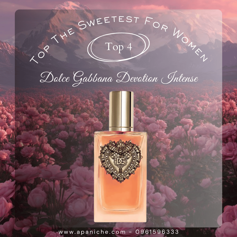 Góp mặt trong danh sách nước hoa nữ mùi ngọt 2025, Dolce Gabbana Devotion Intense đại diện cho hướng tiếp cận ngọt ngào nhưng chín chắn và đậm chất nữ tính. Mùi hương xoay quanh sự kết hợp giữa hạt phỉ, hoa cam và vani, tạo nên cảm giác ngọt ấm, mềm mại nhưng có chiều sâu, không mang màu sắc kẹo bánh trẻ trung như nhiều mùi ngọt khác trong danh sách.